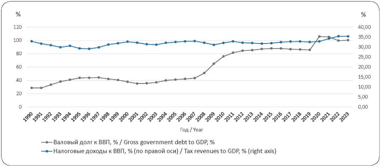 Source: joint authors’ work based on data from: IMF. https://www.imf.org/external/datamapper/GGXWDG_NGDP@WEO/OEMDC/ADVEC/WEOWORLD?year=2025; https://databank.worldbank.org/source/world-development-indicators